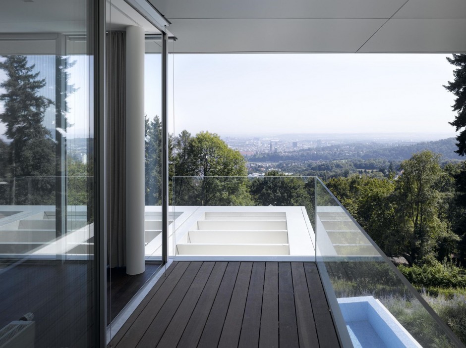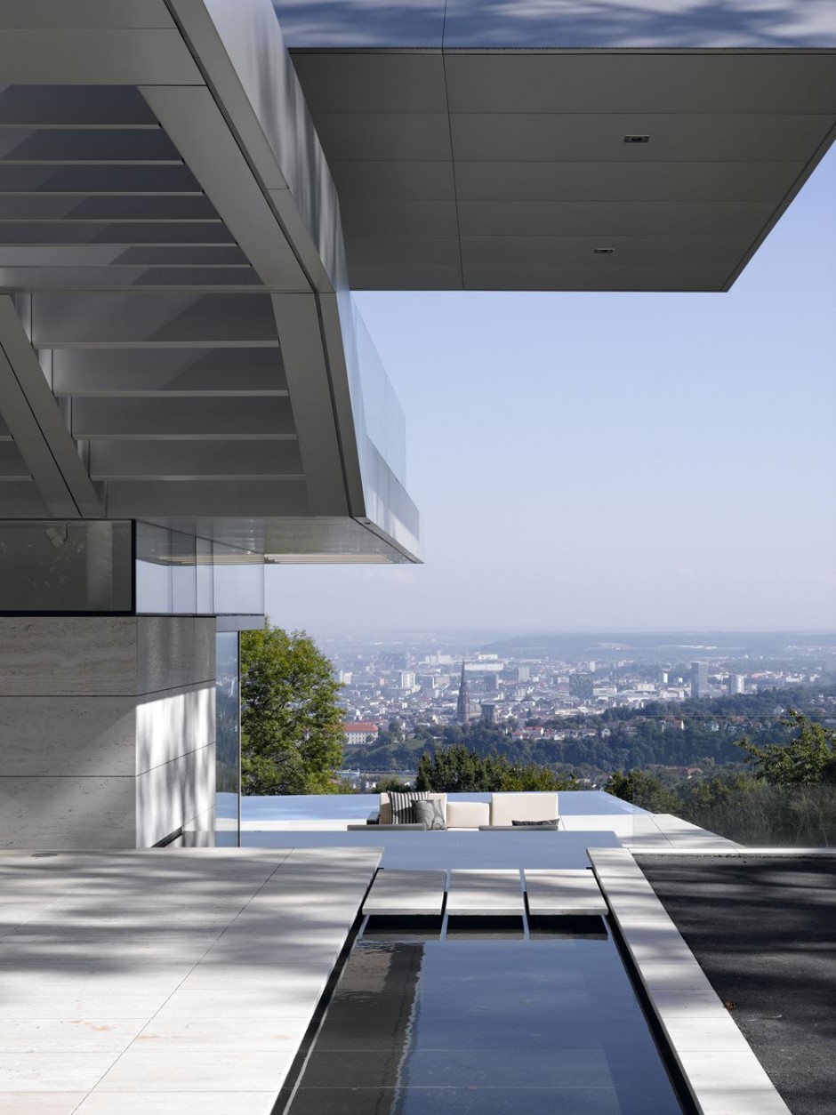 the site is accessed from the路在領先了山to the建筑的主入口,covered by擴展懸臂屋頂結構。on the街建筑立面側是封閉的自然stonework to provide with intimacy towards the街。the other side is open to the完全拉佩斯View over the市。