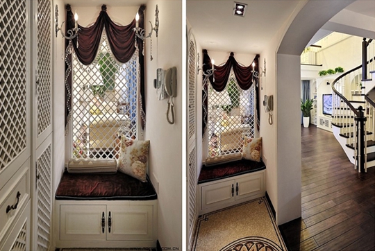 一進(jìn)門就可以看到華麗麗的玄關(guān),左邊是整面的鞋柜,可以滿足一家人的需要,利用格柵可以很好的透氣。正面看過去就是華麗的玄關(guān)造景,可以坐在上面換鞋,又利用墻面遮擋,整體設(shè)計(jì)都很人性化。