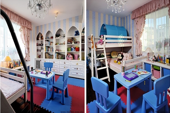 二樓的兒童房設(shè)計(jì)有點(diǎn)偏向于清爽型的地中海風(fēng)格,裝飾柜用很夢(mèng)幻的迪斯尼尖頂造型。整面墻都是做了儲(chǔ)物設(shè)計(jì),藍(lán)白條紋的背景墻以及粉紅色的窗簾顏色,柔和型的搭配很適宜兒童房顏色的搭配法則。