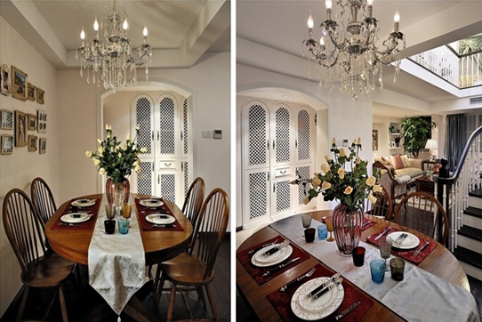 餐廳位置位于二樓上樓處,站在餐廳的一角剛好可以看到在整個(gè)別墅的大致結(jié)構(gòu),客廳,以及上二樓的樓梯位置 。餐廳與廚房也是通過鏤空型的門隔開,頗有幾分歐式風(fēng)格的優(yōu)雅之美。