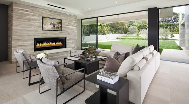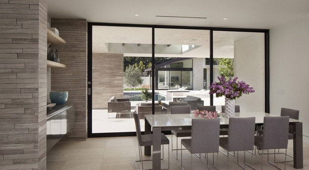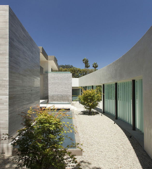 房子位于一條街道,為了減少汽車噪音影響,建筑師用高大的圍墻和大門將庭院與街道隔開,大門兩側(cè)是玻璃百葉,起到緩沖噪音的作用,同時不阻擋光線通過。此外,還設(shè)計了一條路和小橋,將大門和室內(nèi)連接。穿過院子時,可以欣賞水景,也能聽到瀑布墻的流水聲,使人感到非常放松。